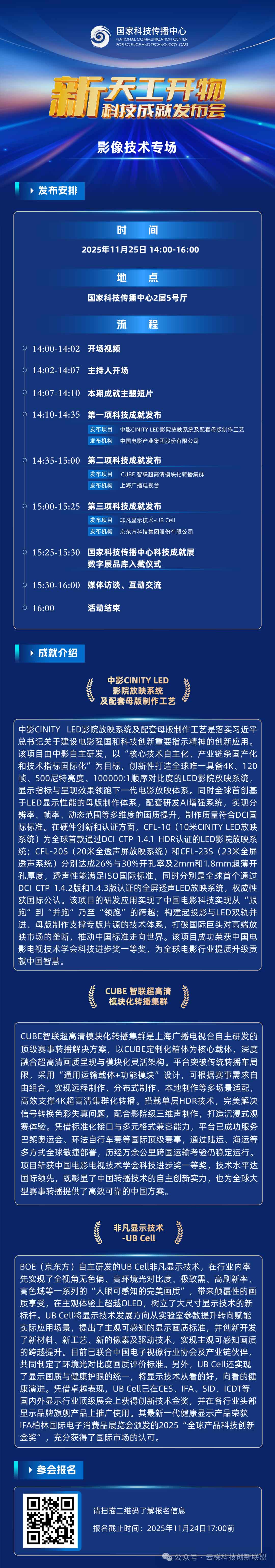 三项发布项目由院士专家联袂推介 + 核心科学家现场讲述,从影院放映体系自主跨越到国际超高清转播智慧解决方案,从产业体系到家庭消费——一场关于影像技术变革的科技成就发布,邀您见证!