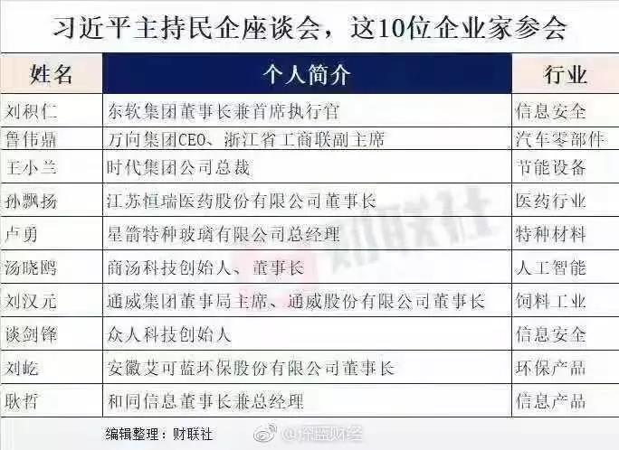 座谈会选了10位企业家发言。乍一眼看,好像都不是很眼熟,不是我们常在新闻里见到的那些民企大佬。不过百度一下,这10位也是大有来头,涉及计算机行业、机械工业、医药行业、人工智能、信息安全、大数据、农业饲料等多个领域,有不少高新科技企业,应该说,他们代表了中国企业转型升级的未来。
