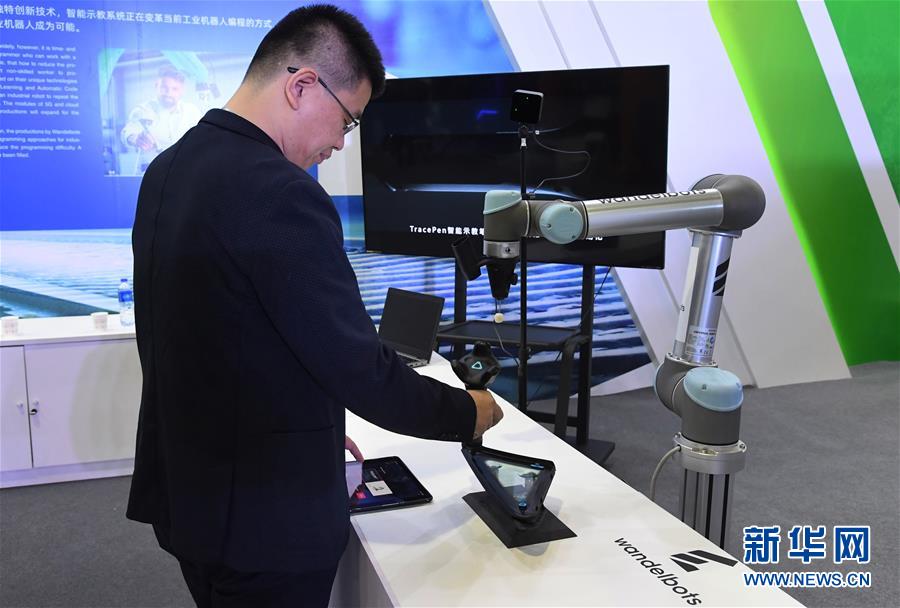 10月16日,在展览现场,工作人员在展示工业机器人智能示教系统。新华社发(任超摄)
