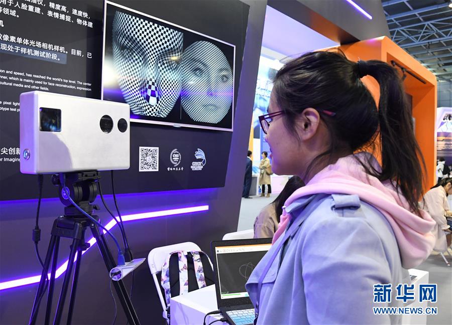 10月16日,在展览现场,工作人员在展示三维动态彩色扫描仪。新华社发(任超摄)