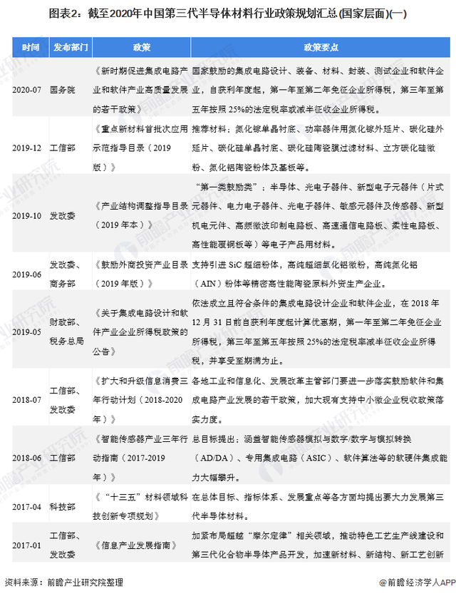 第三代半导体材料行业是我国重点鼓励发展的产业,是支撑经济社会发展和保障国家安全的战略性和基础性产业。“十三五”时期以来,国家层面的政府部门发布了多项关于半导体行业、半导体材料行业的支持、引导政策,这些鼓励政策涉及减免企业税负、加大资金支持力度、建立产业研发技术体系等等: