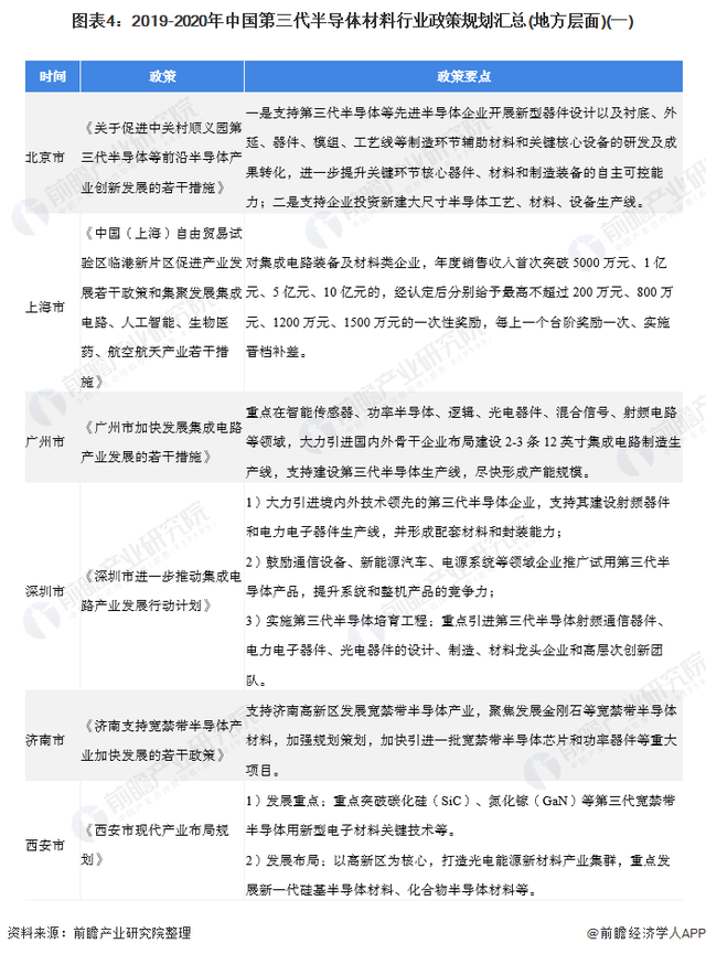 第三代半导体材料行业是我国重点鼓励发展的产业,是支撑经济社会发展和保障国家安全的战略性和基础性产业。为加快推进第三代半导体材料行业的发展,国家层面先后引发《重点新材料首批次应用示范指导目录(2019版)》、《国务院关于印发进一步鼓励软件产业和集成电路产业发展若干政策的通知》等鼓励性、支持性政策;而地方层面也积极响应,通过政策将实质性的人、财、物资源注入,推动着各地半导体材料产业的集聚和发展。