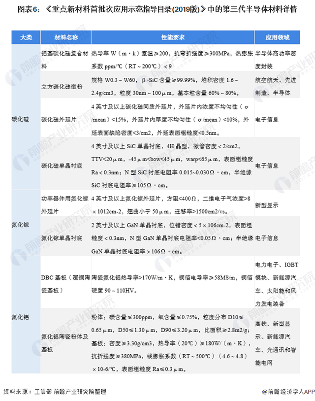 为进一步做好重点新材料首批次应用保险补偿试点工作,工信部于2019年12月发布的《重点新材料首批次应用示范指导目录(2019版)》(自2020年1月1日起施行),其中碳化硅、氮化镓和氮化铝材料均有入选《目录》,具体如下: