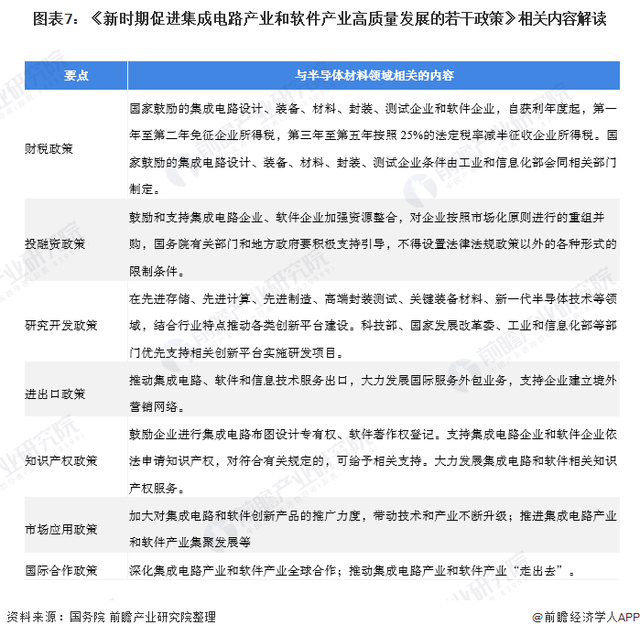 集成电路产业和软件产业是信息产业的核心,是引领新一轮科技革命和产业变革的关键力量。为进一步优化集成电路产业和软件产业发展环境,深化产业国际合作,提升产业创新能力和发展质量,国务院于2020年7月发布《新时期促进集成电路产业和软件产业高质量发展的若干政策》,《政策》在财税、投融资、研究开发、进出口、人才、知识产权、市场应用以及国际合作八个方面阐述了支持举措。其中与半导体材料相关的内容如下: