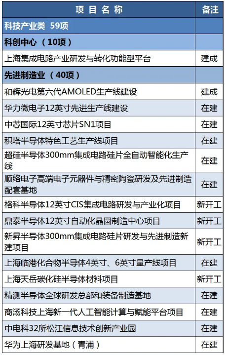 此外,科技产业类项目还包括华力微电子12英寸先进生产线建设、中芯国际12英寸芯片SN1项目、积塔半导体特色工艺生产线、超硅半导体300mm集成电路硅片全自动智能化生产线、格科半导体12英寸CIS集成电路研发与产业化项目、鼎泰半导体12英寸自动化晶圆制造中心项目、新昇半导体300mm集成电路硅片研发与先进制造新建项目、上海临港化合物半导体4英寸、6英寸量产线等项目。