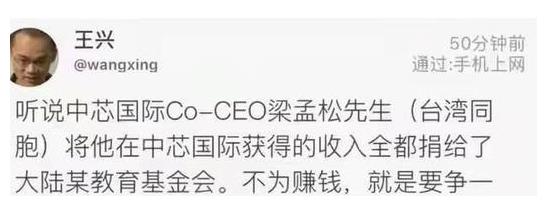 实际上这次中芯国际给梁孟松的福利做的很对,首先梁孟松不是因为钱才加入中芯,不妨想想,要是他是因为钱才加入中芯,那点薪资能让他无休无止的为中芯工作3年嘛?还有之前三星开三千万美元给他,他都没去,而且他的收入全部都捐给了教育基金会,他是值得尊敬的科学家,这点就连美团的王兴也发文表示佩服。