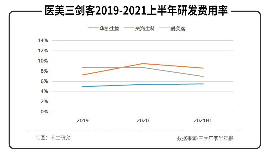 据医美三??筒票ㄏ允荆跎?019-2021上半年研发费用率分别为4.98%,5.36%,5.52%;同期,昊海生科的研发费用率为7.24%,9.49%,8.63%;而爱美客同期研发费用率为8.71%,8.71%,6.97%。